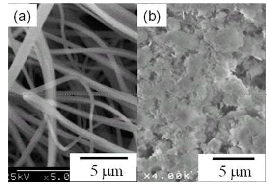 Ohkawa et al. have continued their applied studies on cellulose-composite-ESNWs using sub-components which are relatively stable, even in neat TFA solutions. Figure 4 is an example study for this approach, and the cellulose-ESNW subcomponent is a synthetic polypeptide, copoly[Ser(PO3H2)x, Aspy] (x:y = 100:0, 75:25, 50:50, 25:75), on which serine residues are fully phosphorylated. The weight ratio of copoly[Ser(PO3H2)x, Aspy] towards cellulose was 1.0–1.2 wt % in a TFA solution, and then after the ES process, the products, cellulose-copoly[Ser(PO3H2)x, Aspy]-composite-ESNW, was observed using a scanning electron microscope (Figure 4) [47]. The chemical structure of copoly[Ser(PO3H2)x, Aspy] was designed on the basis of osteogenic proteins, of which their role is to induce the hydroxyapatite deposition to make hard tissues, teeth and bone. Since the synthesis route of the copolypeptide involves the final deprotection step in TFA, the ES solvent of the cellulose-copoly[Ser(PO3H2)x, Aspy]-composite-ESNW does not affect the chemical structure of the subcomponent. A series of in vitro experimental results indicated that the composite ESNWs were able to induce hydroxyapatite deposition, which is associated with the crystalline polymorph transition similar to those occurred in vivo, and potential application of the cellulose-copoly[Ser(PO3H2)x, Aspy]-composite-ESNWs is, hence, applied as the scaffolding materials for hard tissue engineering. As described above, reasonable design of the subcomponents and their chemical structures, which are derived from biological components, enables biomedical studies by the dES process and fabrication of cellulose-based-composite ESNWs [48,49].