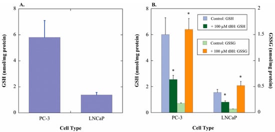 GSH content and oxidant-induced GSH oxidation in PC-3 and LNCaP cells. (A) GSH was measured in total cell extracts by the GSH Glo™ Glutathione Assay kit, which is a luminescence-based assay coupling the GSH S-transferase (GST)-catalyzed conversion of a luciferin derivative to luciferin, which is then metabolized by the ATP-dependent firefly luciferase to emit light, which is then read in a plate reader in the luminescence setting. GSH content was calculated from a GSH standard curve. Results are means ± SEM of measurements from 3 separate cultures; (B) Cells were incubated for 1 h with either cell culture medium (=Control) or 100 µM tert-butyl hydroperoxide (tBH). Concentrations of GSH and GSSG in total cell extracts were then measured by use of Ellman’s reagent with or without 2-vinylpyridine, respectively, and measurement of A412. GSH and GSSG contents were calculated from a GSH standard curve. Results are means ± SEM of measurements from three separate cultures. * Significantly different (p < 0.05) from the corresponding control.