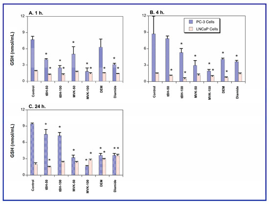 To further assess the GSH pool in the two cell lines, each cell line was treated for up to 24 h with either cell culture medium (=Control) or various toxicants and GSH concentrations were measured at 1, 4, and 24 h (Figure 2). The toxicants used to probe responses to oxidants or GSH-depleting agents included tBH, which causes lipid peroxidation and GSH oxidation, methyl vinyl ketone (MVK), which is a direct-acting alkylating agent that depletes GSH, and diethyl maleate (DEM) and diamide, both of which are electrophiles that deplete GSH by forming GSH S-conjugates. tBH and MVK were added at 50 µM or 100 µM and DEM and diamide were each added at 250 µM. Both cell lines exhibited generally similar degrees of GSH depletion, except at the 100 µM concentration of tBH or MVK, where toxicant treatment of PC-3 cells reduced cellular GSH concentrations to levels close to those found in the LNCaP cells. Thus, it appears that susceptibility of the cellular GSH pool of the two cell lines to oxidants cannot explain the differences in their growth rates or sensitivity to chemotherapeutic agents.