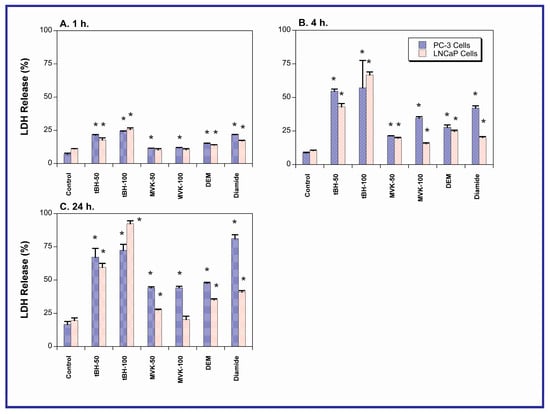 Chemically induced LDH release in PC-3 and LNCaP cells. Cells were grown to 80%–90% confluence in either F12 or RPMI media, respectively, supplemented with 10% FBS. Prior to experiments, media were removed and replaced with serum-free media. After 1-, 4-, or 24-h incubations with either tBH or MVK (10, 50, 100, 200 µM), or 250 µM of either DEM or diamide, LDH release was determined as NADH oxidation at 340 nm. Results are the means ± SEM of measurements from six cell cultures. * Significantly different (p < 0.05) from the corresponding control.