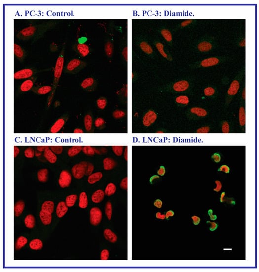 Sensitivity of PC-3 and LNCaP cells to diamide-induced apoptosis as assessed by the TUNEL assay. DNA fragmentation was assayed with the ApoBrdU TUNEL Assay Kit from Invitrogen (Carlsbad, CA, USA), using confocal microscopy. Cells were grown on 35 mm dishes. After incubation for 24 h with either media (=Control) or 250 µM diamide, cells were fixed in paraformaldehyde and 70% ethanol. DNA strand breaks were detected by an Alexa Fluor 488 dye-labeled anti-BrdU antibody and the resultant green nuclear fluorescence in contrast to the red fluorescence generated from nuclear propidium iodide staining. Bar = 5 µm.
