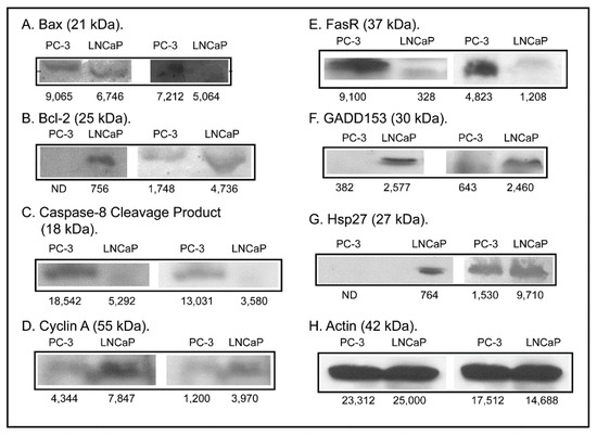 Western blot analysis of selected proteins regulating apoptosis, cell growth, and stress response. Protein (100 µg) from total cell extracts of PC-3 and LNCaP cells were loaded onto 10%, 12%, or 15% SDS polyacrylamide gels. After electroblotting of protein onto nitrocellulose paper, blots were blocked for 1 h in 5% milk powder solution and incubated overnight with primary antibody. Blots were washed 3× with TTBS and incubated with appropriate secondary antibody conjugated to alkaline phosphatase (Jackson ImmunoResearch, West Grove, PA, USA) or horseradish peroxidase, for 1 h. Blots were washed 3–6× in TTBS and then assayed for color development using BCIP/NBT as substrates (Promega, Madison, WI, USA) or using the Pierce ECL Western Blotting Substrate Kit. β-Actin was used as a housekeeping protein. Band density for samples was determined with GelEval 1.3.7 for Mac OS X. Results are from two sets of cell cultures for each cell line.