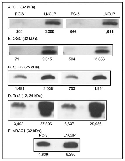 This contrasts with the observations on sensitivity of the two cell lines to tBH-, MVK-, DEM-, and diamide-induced LDH release. Higher levels of these cytoprotective proteins may be a compensatory response to the low GSH concentrations characteristic of this cell line. The higher expression of FasR in LNCaP cells, however, suggests that these cells are more susceptible to apoptosis by the extrinsic pathway. Although the distinct mitochondrial pool of GSH was not separately analyzed in this study, differences in mitochondrial function may be critical to the proliferative properties of the two cell lines, as suggested by the “bioenergetics theory of prostate malignancy” [12]. As a first step in assessing the involvement of mitochondria in differentiating the aggressiveness and growth of these two PCC lines, expression of two mitochondrial inner membrane carriers involved in the uptake of GSH and two important antioxidant proteins was determined (Figure 6).