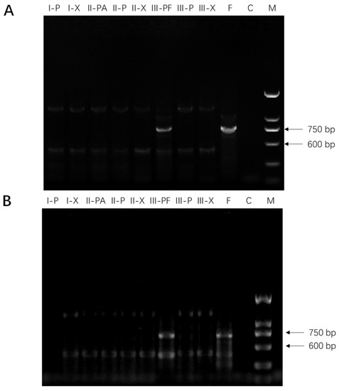 Detection of F. solani (strain F19, panel (A)) and F. oxysporum (strain C1, panel (B)) in American ginseng root tissues using polymerase chain reaction (PCR). Gel lanes show the presence of PCR products from left to right: (I-P), phloem of part I; (I-X), xylem of part I; (II-PA), phloem under PDA plugs of part II; (II-P), area adjacent to PDA plugs of part II; (II-X), xylem of part II; (III-PF), phloem under Fusarium culture plug of part III; (III-P), adjacent Fusarium culture plugs of part III; (III-X), xylem of part III; (F), positive control (Fusarium spp.), (C), negative control (no DNA template), and (M), DNA ladder.