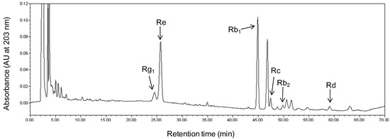 Representative retention peaks of a high performance liquid chromatography (HPLC) separation of ginsenoside Rg1, Re, Rb1, Rc, Rb2, and Rd, extracted from American ginseng roots.