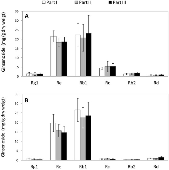 The slopes of the six calibration curves followed the order Rg1 > Rd > Re > Rb2 > Rb1 > Rc, indicating that the HPLC detection sensitivities for the contents of these ginsenosides were reduced in this order. A representative HPLC elution profile of ginsenoside Rg1, Re, Rb1, Rc, Rb2, and Rd, in healthy ginseng roots is shown in Figure 2. The mean values ± SD of specific recovery rates with five replicates are (%): Rg1 99.35 ± 1.18; Re 99.85 ± 1.76; Rb1 97.25 ± 1.30; Rc 100.21 ± 0.43; Rb2 97.89 ± 1.93; and Rd 95.11 ± 0.97. Regardless of the tissue type (xylem or phloem), the difference in ginsenoside content between the three ginseng root parts (part I, II, and III) was not significant in healthy ginseng roots (Figure 3).