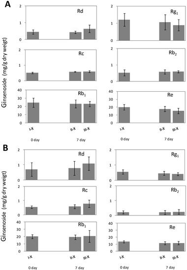 Ginsenoside contents were also measured in the xylem of ginseng roots after inoculation of F. solani or F. oxysporum. Infection by either of the two Fusarium species did not affect the level of any of the six ginsenosides in the corresponding xylem tissues (Figure 5).