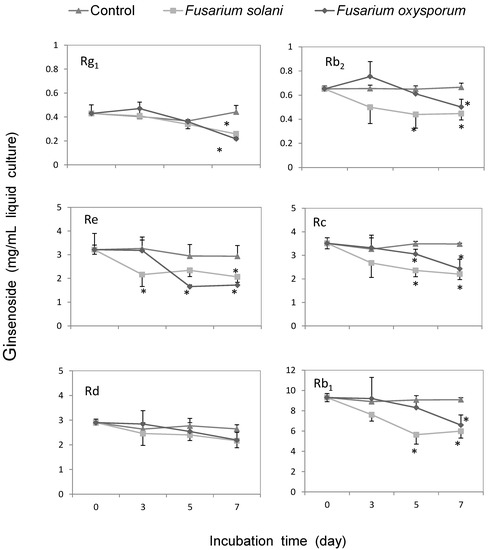 Metabolic effect of Fusarium solani and F. oxysporum on the concentrations of ginsenoside. Ginsenoside Rg1, Rb2, Re, Rc, Rd, and Rb1, were incubated with F. solani (square) or F. oxysporum (diamond) for 0 to 7 days. The values of ginsenoside content followed by an asterisk indicate a significant difference with control group (trilateral) at α = 0.05 (p < 0.05), as analyzed using Fisher’s least significant difference (LSD) test.
