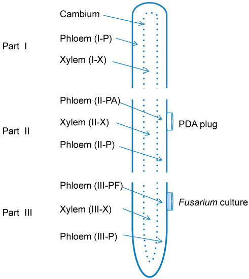 For molecular diagnosis of the pathogen and analysis of ginsenoside contents, ginseng root parts I (the untreated group), II and III were peeled from the visible cambium. The outside tissue of cambium was considered as phloem, while the inside part was xylem. Moreover, phloem tissues underneath the mycelium of parts III (showing lesions) or control plugs of parts II (medium only) were separated from the adjacent phloem tissues. A total of eight different sample groups were analyzed, including phloem of root part I (I-P), xylem of part I (I-X), phloem under PDA plug of part II (II-PA) and adjacent area (II-P), xylem under the plug of part II (II-X), phloem under Fusarium culture plug of part III (III-PF) and adjacent area (III-P), and xylem of part III (III-X) (Figure 7). There were five replicates per treatment. All the eight groups were used for molecular detection of the two Fusarium spp. as described below, while seven groups were used for ginsenoside quantification, including I-P as background check, II-PA as a control, III-PF and III-P as inoculated groups of phloem; I-X, II-X, and III-X as background check, control and inoculated groups of xylem, respectively.