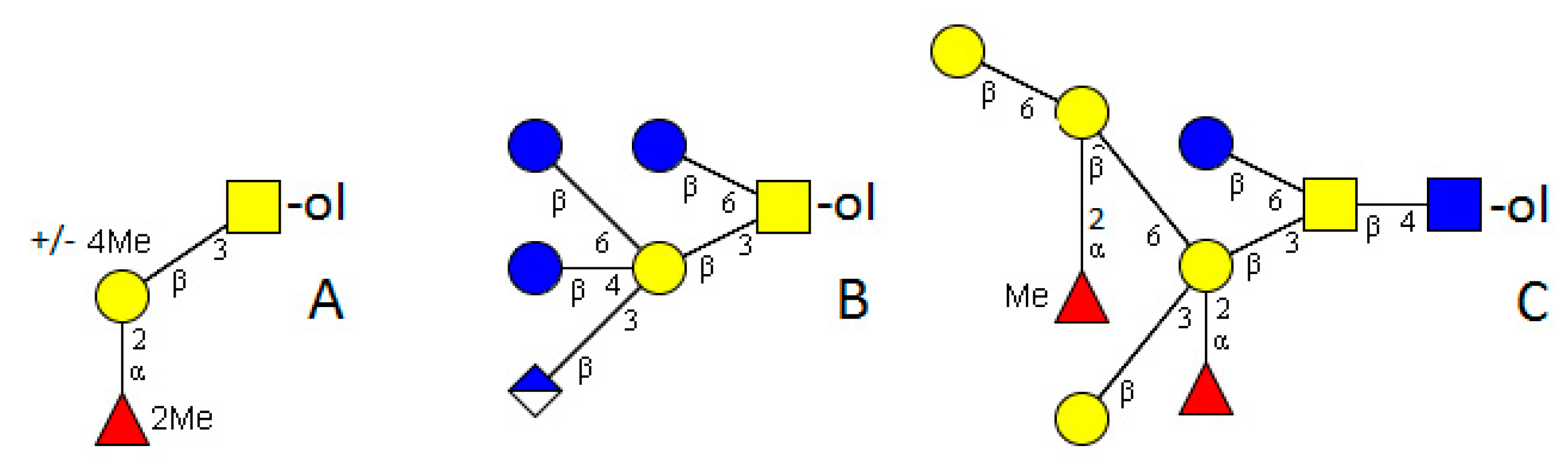 - Staudacher, E. Methylation—An uncommon modification of glycans. Biol. Chem. 2012, 393, 675–685. [Google Scholar] [CrossRef] [PubMed]