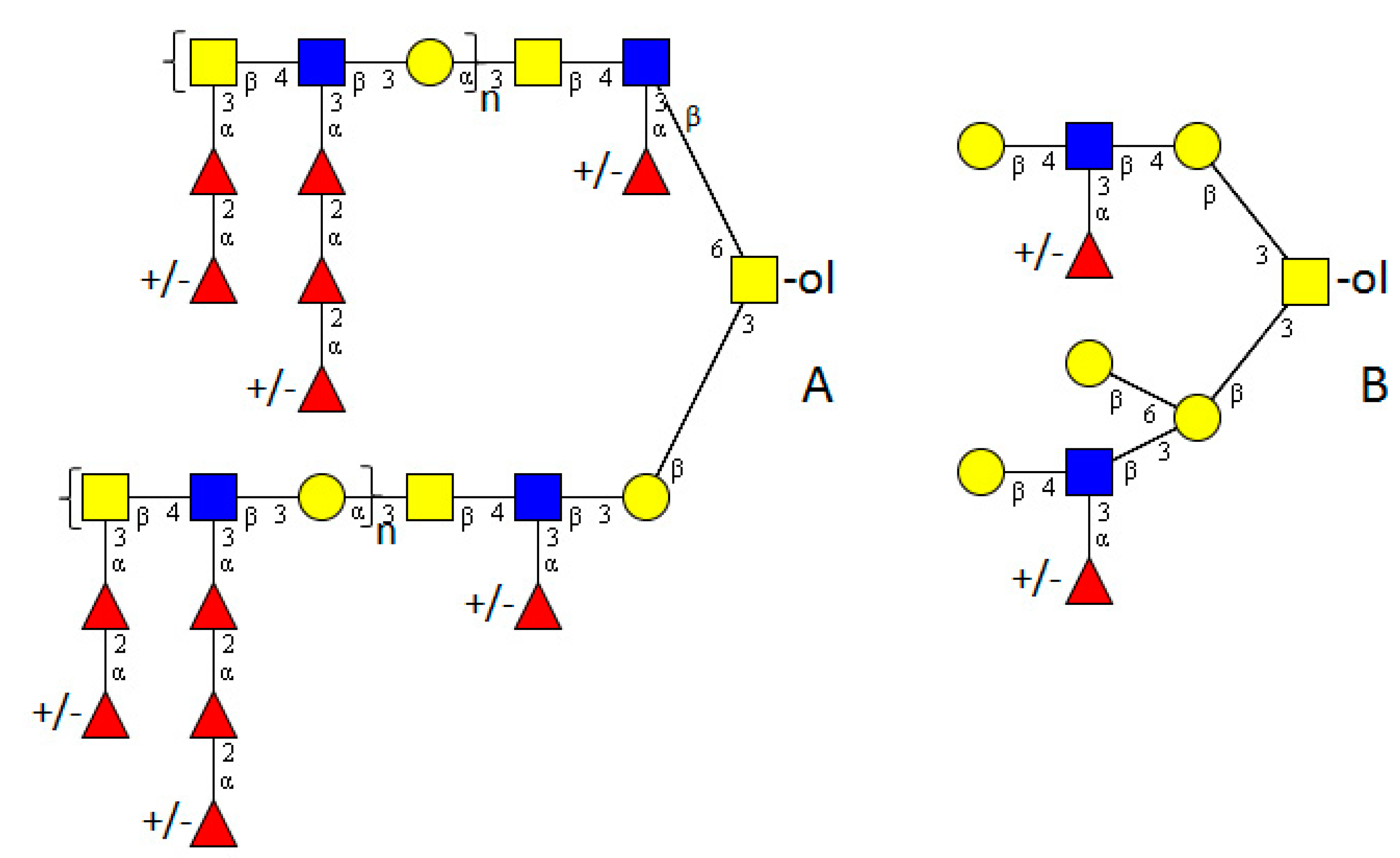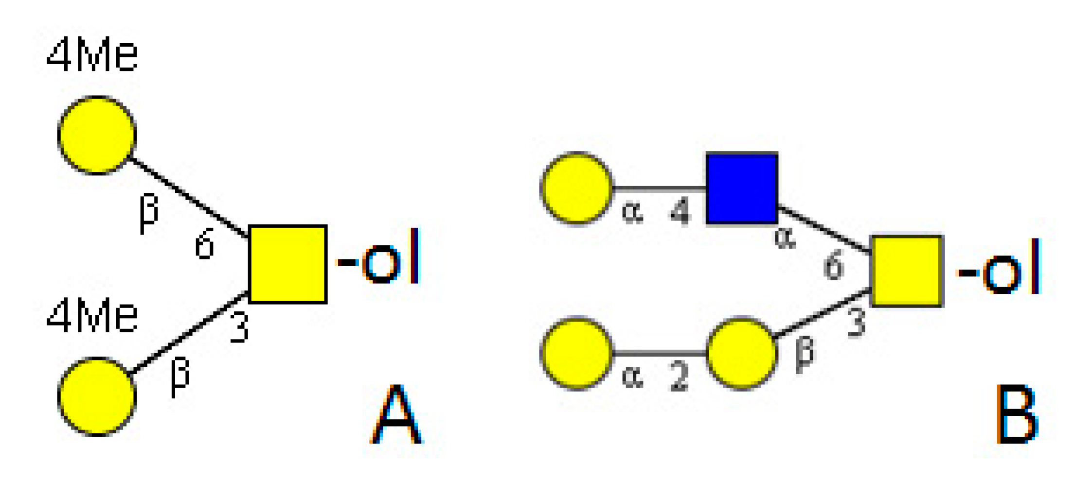 - Khoo, K.H.; Sarda, S.; Xu, X.; Caufield, J.P.; Mcneil, M.R.; Homans, S.W.; Morris, H.R.; Dell, A. A unique multifucosylated -3GalNAcβ1-4GlcNAcβ1-3Galα1-motif constitutes the repeating unit of the complex O-glycans derived from the cercarial glycocalyx of Schistosoma mansoni. J. Biol. Chem. 1995, 270, 17114–17123. [Google Scholar] [CrossRef] [PubMed]