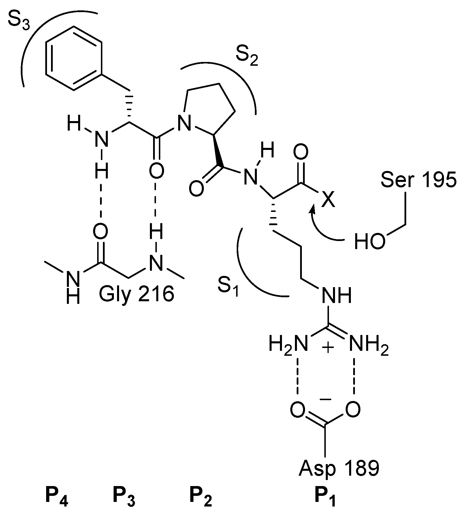 Schematic representation of the binding mode of a d-Phe-Pro-Arg type inhibitor to the active site of thrombin.