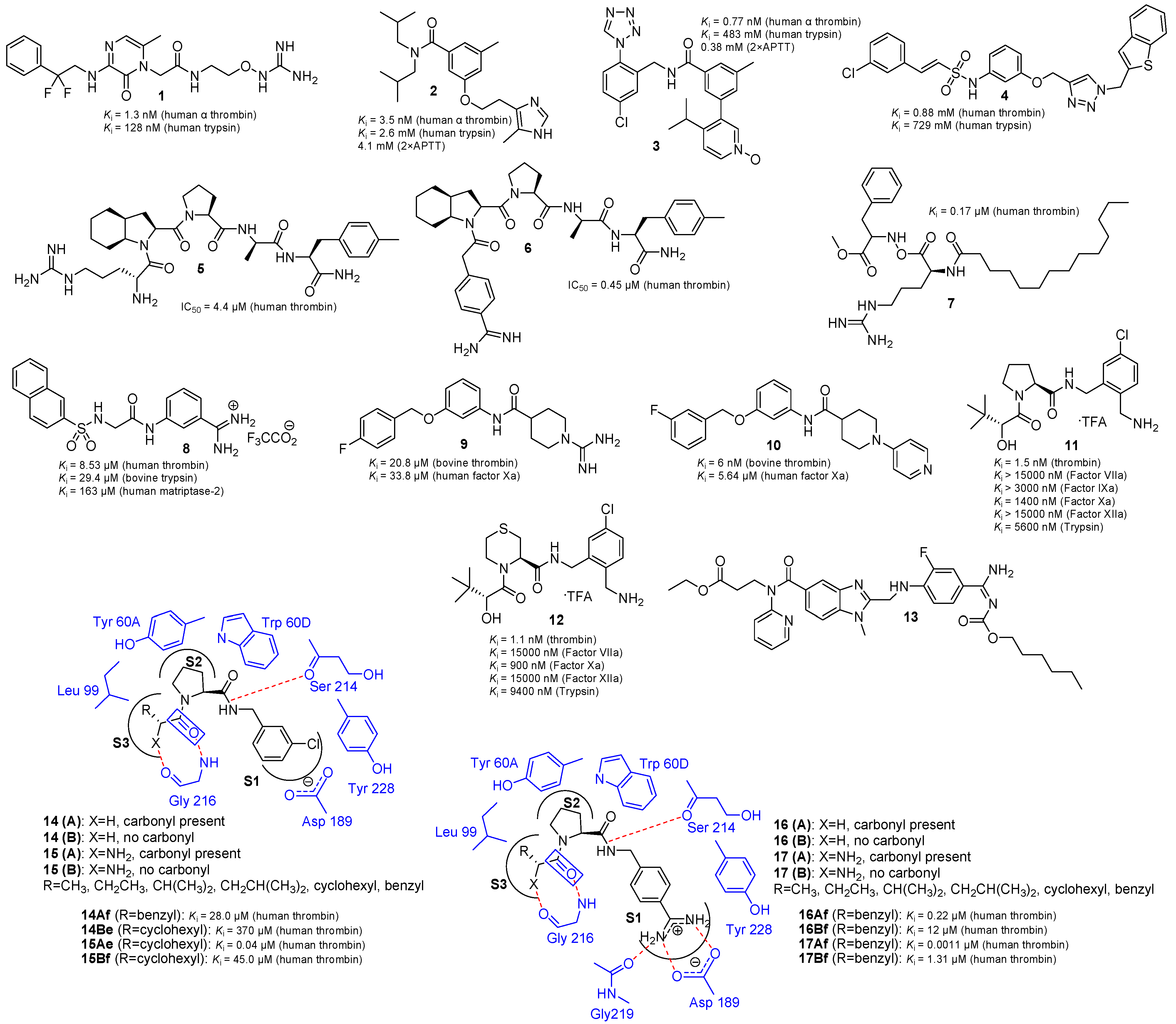During the past three decades, significant progress has been made, in the development of synthetic thrombin inhibitors as new anticoagulants. Straub et al. summarized the research on thrombin inhibitors with 26 references in 2011 [8]. Mehta et al. have published an update on recent (2010–2013) patents on thrombin inhibitors [9]. Steinmetzer and Stürzebecher summarized the synthetic thrombin inhibitors with both poor and high selectivity in 2004 [10]. Das and Kimball gave a brief review of indirect and direct thrombin inhibitors in 1995 [11]. This review focuses on the development of orally active thrombin inhibitors for treating thrombotic disorders since 2010, and thus could serve as an updated reference for interested researchers.