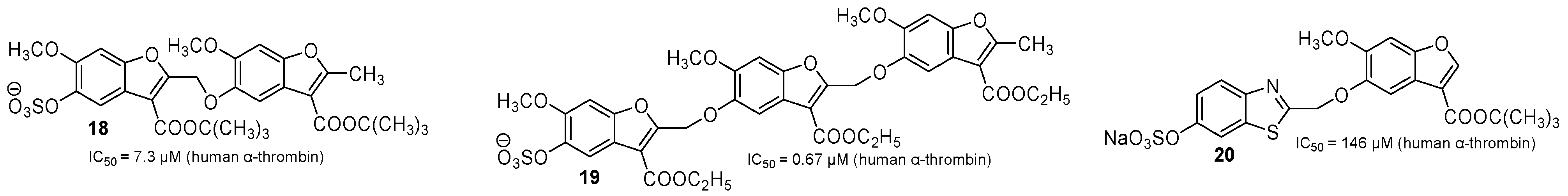 - Abdel Aziz, M.H.; Sidhu, P.S.; Liang, A.; Kim, J.Y.; Mosier, P.D.; Zhou, Q.; Farrell, D.H.; Desai, U.R. Designing allosteric regulators of thrombin. Monosulfated benzofuran dimers selectively interact with Arg173 of exosite 2 to induce inhibition. J. Med. Chem. 2012, 55, 6888–6897. [Google Scholar] [CrossRef] [PubMed]