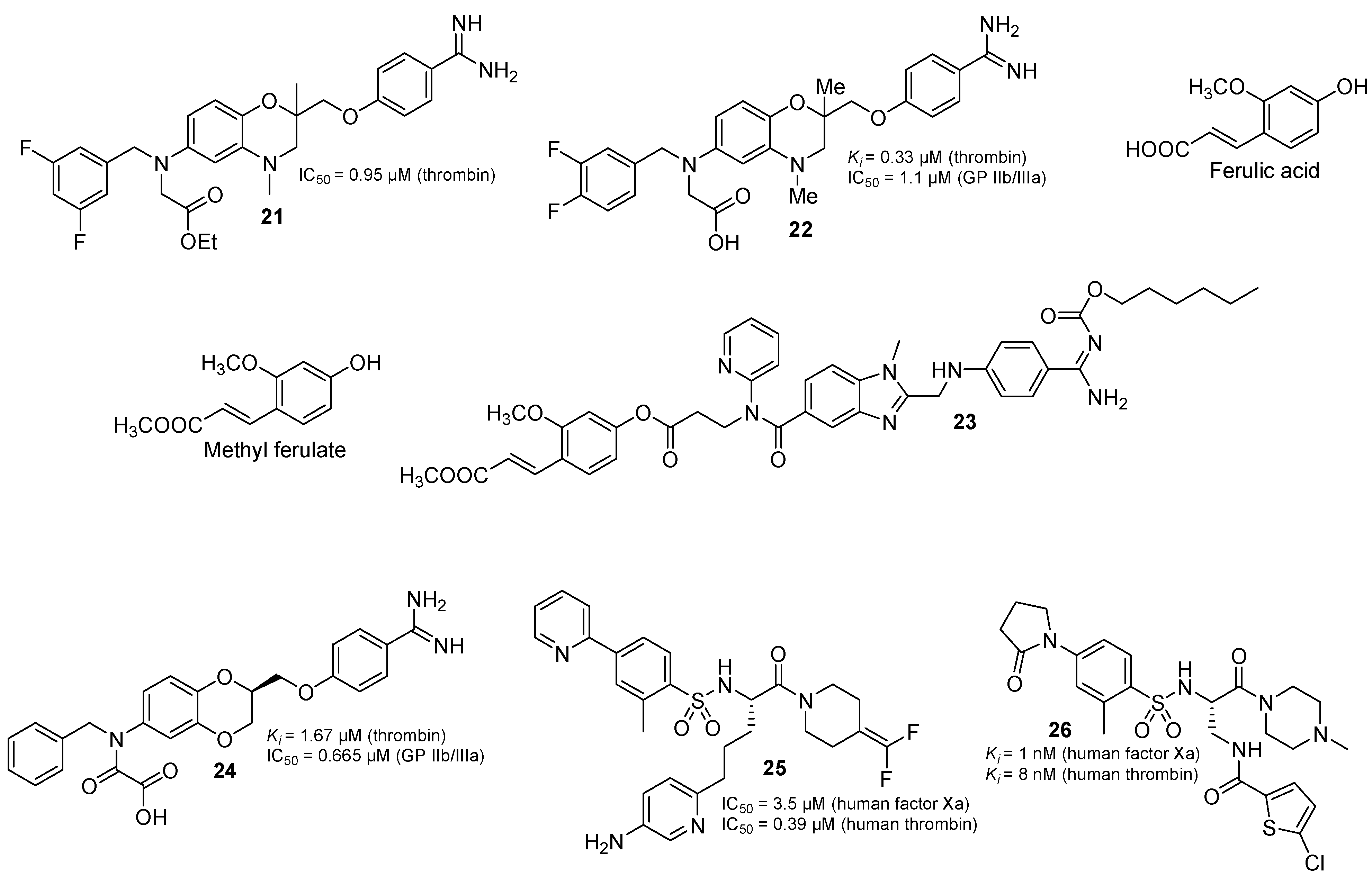 Under normal circumstances, endothelial cells played a critical role in preventing intravascular thrombosis: (i) by providing a unique surface which prevented activation of coagulation and platelet aggregation and (ii) by releasing mediators that inhibited prothrombotic processes. However, these endothelial cells were vulnerable to oxidative stress, which was initiated by reactive oxygen species (ROS) diffusing from leukocytes or generated in the endothelium in the context of inflammation [46]. It could therefore be anticipated that antithrombotic therapy with anticoagulant and/or antiplatelet agents, combined with interventions directed against vascular oxidative stress and/or inflammation, both boosting endothelial antithrombotic activity, would display a synergistic action in the treatment of thrombosis. In 2011, Ilić et al. synthesized some compounds that combine the thrombin inhibitory activity, lipid peroxidation and lipoxygenase inhibition in the same molecule [47]. The resulting compound 21 (Figure 5) was found to be submicromolar thrombin inhibitor (IC50 = 0.95 µM), it was also very potent to inhibit lipid peroxidation (IC50 = 36 µM), this made compound 21 an interesting candidate for further investigations towards multi-target antithrombotic drugs.