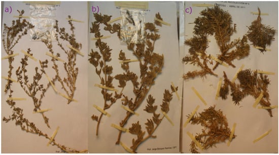 Pictures of herbarium specimens of (a) Nolana leptophylla, (b) N. aplocaryoides and (c) N. ramosissima collected in Paposo Valley, II region of Chile.