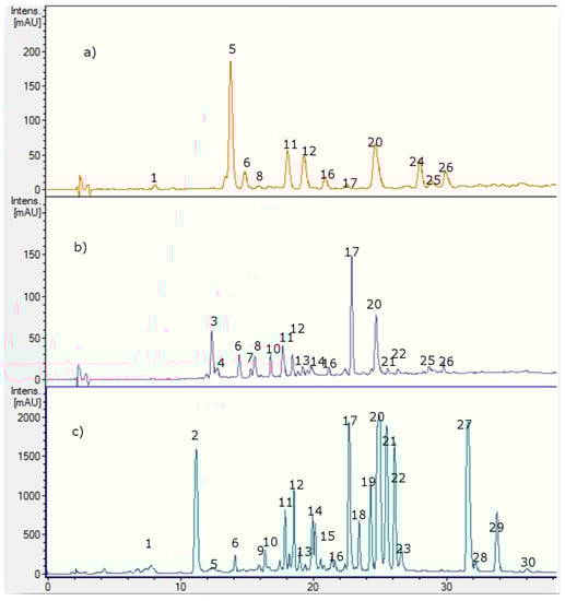 HPLC-UV chromatograms at 280 nm of (a) Nolana leptophylla, (b) N. aplocaryoides and (c) N. ramosissima collected in Paposo Valley, II region of Chile.