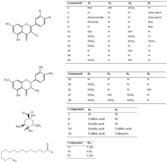 Several polyphenolics in Nolana species were detected and identified using HPLC with UV-visible data (PDA, Figure 2, Table 1) and ion trap electrospray mass spectrometry (IT-ESI-MS, Table 2). The 30 compounds identified in Nolana ramosissima, N. aplocaryoides and N. leptophylla were mainly flavones, flavanones, phenolic acids, fatty acids, some glycoside flavonoid conjugates and their derivatives. Twenty one compounds were detected in Nolana ramosissima, (Peaks 1, 2, 5, 6, 9–23 and 27–29), nine in N. leptophylla (Peaks 1, 6, 11, 16, 17, 20, 24, 25 and 26) and fourteen in N. aplocaryoides, (Peaks 3, 4, 6, 7, 8, 10–17, 20 and 21) (Figure 2, Table 2), respectively. Below is the detailed explanation and identification of the compounds using HPLC and PDA and MSn analysis plus co-elution with some of the authentic available standards. Figure 2 shows the HPLC fingerprints at 280 nm, Figure 3 the structures of the main compounds detected and Figure 4, Figure 5, Figure 6 and Figure 7 full MS and MSn spectra of several compounds detected.