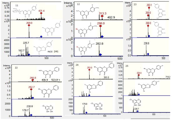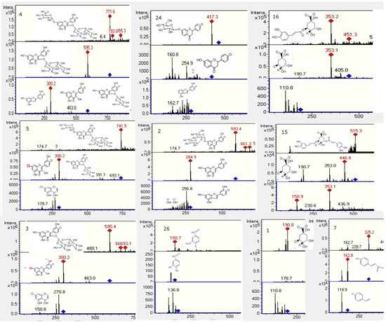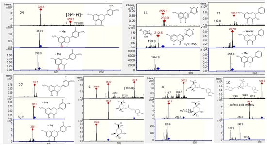 MS profiling of Peak 2 produced a parent ion at m/z 593 (Figure 4) and daughter ions at m/z 285 [M − H − rutinose]−, 257, 179 and 151, corresponding to luteolin aglycone and its fragment ions, revealing the compound to be luteolin-7-O-rutinoside [21]. Peak 3 (Figure 4) was identified as quercetin-3-O-glucosyl-pentoside (595, and MSn ions at m/z 463, 301, 179 and 151) [22]. Peak 4 with a [M − H]− ion at m/z 771, producing daughter ions at 595 (loss of 176 mass units, a glucuronide moiety), 463 (quercetin-3-O-glucoside) and 301 (quercetin, with MS3 179 151), was identified tentatively as quercetin-3-O-glucosyl-pentoside-7-O-glucuronide (Figure 4). Likewise, Peak 5 with a [M − H]− at m/z 741 and MSn ions at m/z 609 (rutin, by loss of xylose or the rutinose moiety, 132 u), 591 (rutin−H2O), 301 (quercetin), 179 and 151 was tentatively identified as a rutin pentoside (Figure 4) [23]. Peak 9 was identified as rutin ([M − H]− ion at m/z 609, MS at 301, 179 and 151) by co-elution with an authentic standard. Peak 10 (Figure 5) with a [M − H]− parent ion at m/z 529, which yielded a feruloylquinic acid ion at m/z 365, was identified as a feruloyl-caffeoylquinic acid derivative. Peak 11 (Figure 5) presented a pseudomolecular ion at m/z 431, which experienced a hexoside loss (162 u) to produce an apigenin ion at m/z 269 and, thus, was identified as 8-O-glucosyl-apigenin. This compound was identified with a spiking experiment with the authentic compound. Peak 12 showed UV maxima at 268 and 346 nm, characteristic for 3′,4′ dimethoxyflavones [10]. This peak showed precursor ions at m/z 315 [M + H]+ and at m/z 313 [M − H]−. The MS/MS spectrum in negative ionization mode showed product ions at m/z 298 and at m/z 283, formed after elimination of methyl groups and probably indicating a dimethoxyluteolin. These data led to identification of this peak as 4′,7′ -dimethoxyluteolin (4′,5-dihydroxy-3′,7-dimethoxyflavone) [11,24], which was also compared with an authentic compound. Peak 20 with a [M − H]− ion at m/z 269 and a daughter fragment at m/z 255 ([M − H − CH3]−) was identified using co-elution with an authentic standard of pinostrobin, which was isolated from this plant previously by us, and its structure was elucidated by single-crystal X-ray analysis [25]. In the same manner, Peak 19 was identified as the related compound pinocembrin (5,7-dihydroxy-flavanone). A related compound with different UV-VIS data (λ max 292, 330), Peak 21 (Figure 5), showed a [M − H]− ion at m/z 285 and MS1 ion at m/z 267 ([M − H − H2O]−) and 251 ([M − H − H2O − CH3]−). This compound was identified as 3,5-dihydroxy-7-methoxyflavanone by spiking experiments with the authentic compound. Peak 22 (Figure 6) with a pseudomolecular ion at m/z 267 and daughter fragment at m/z 253 ([M − H − CH3]−, chrysin) was identified as 5′hydroxy-7-methoxyflavone or chrysin-7-methyl ether. Peak 23 (Figure 6) with a pseudomolecular ion at m/z 283 and an MS1 ion at m/z 268 was identified as 4,5-dihydroxy-7-methoxyflavone or apigenin 7-methyl-ether standard. Peak 24 with [M − H]− at m/z 417 and an MS1 ion at m/z 255 (liquiritigenin) was identified as the glucosylated flavanone liquiritin [26]. Peak 25 (Figure 6) showed [M − H]− ions at m/z 269 and produced daughter ions at m/z 240, 182 and 151 (substituted Rings A and B) and was identified as apigenin. Peak 27 (Figure 5) showed a [M − H]− ion at m/z 315 and MSn ions at m/z 300 and 284 produced by the loss of two methyl groups, which pointed to the presence of a dimethoxylated flavanone and, thus, was tentatively identified as 3′,5-dihydroxy-4′,7-dimethoxyflavanone, the identity being confirmed with the compound previously isolated from the plant. Peak 28 showed a [M − H]− ion at m/z 253 and fragments characteristic of Rings A and B of dihydroxyflavones and was identified as chrysin. Likewise, Peak 29 showed a [2M − H]− adduct ion at m/z 659 and [M − H]− ion at m/z 329, which produced daughter ions at m/z 314 and m/z 299, which evidenced the loss of two methyl groups from the parent 329 ion and, consequently, was tentatively identified as 5-hydroxy-3′,4′,7-trimethoxy-flavanone, the identity being confirmed with the compound previously isolated from the plant. In the same manner, a related flavone (UV max 254, 354 nm) identified with Peak 17 showed a pseudomolecular ion at m/z 327, which produced daughter ions at m/z 312 and m/z 297, which evidenced the loss of two methyl groups from the parent ion and was identified as 5-hydroxy-3,4′,7-trimethoxyflavone. Peak 30 showed a pseudomolecular ion at m/z 283 producing a fragment at 268 (M-methyl group) and was tentatively identified as apigenin methyl ester [27].
