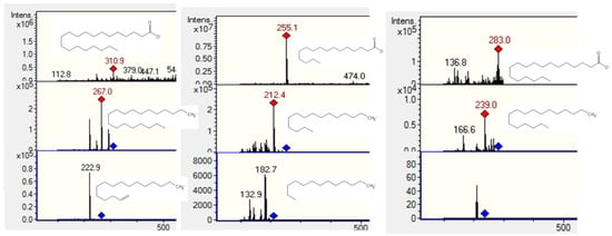 Peaks 13, 18 and 23 (Figure 7) were identified as saturated fatty acids. They showed [M − H]− ions at m/z 283, 255 and 311 [28] and neutral CO2 losses at m/z 238, 212 and 267, respectively, and were thus characterized as stearic, palmitic and arachidic acids. Further identification of the compounds was performed by TLC comparison with authentic samples (Silica gel F254 TLC plates, Merck, Darmstadt, Germany, with the solvent system n-hexane-ethyl acetate 7:3 v/v and developed with a solution of vanillin 1% in ethanol and 10% sulfuric acid and heating).