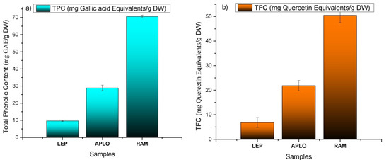(a) Total phenol content (TPC) and (b) total flavonoid content (TFC) of Nolana leptophylla (LEP), N. aplocaryoides (APLO) and N. ramosissima (RAM) collected in Paposo Valley, II region of Chile.