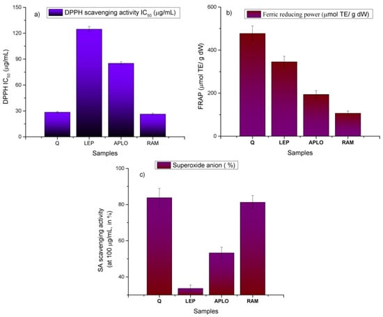 The antioxidant capacity cannot be evaluated using a single test according to several authors [34]. Thus, three commonly-used assays, differing in their working principles (Figure 9), were employed in this work, using the DPPH method (Figure 9a), the ferric-reducing antioxidant power (FRAP; Figure 9b) and the superoxide anion scavenging activity assay (SA; Figure 9c). The DPPH assay is based on the hydrogen donating capacity to scavenge DPPH radicals, while the FRAP assay is an electron transfer-based test measuring the substance ability to reduce Fe3+ to Fe2+ [35]. The superoxide anion scavenging properties of a compound reduces the speed of the appearance of a formazan chromophore formed in a specific reaction using the xanthine-xanthine oxidase system [36]. In this work, the order of the antioxidant activity measured by the bleaching of the radical DPPH and the ferric reducing antioxidant power (FRAP) shown by the three Nolana plants was Nolana ramosissima > N. aplocaryoides > N. leptophylla. A similar trend was observed for superoxide anion scavenging activity. Indeed, N. ramosissima showed the highest antioxidant activity (26.35 ± 1.02 μg/mL, 116.07 ± 3.42 μM Trolox equivalents (TE)/g dry weight and 81.23% ± 3.77% of inhibition in the DPPH, FRAP and SA assays, respectively (Figure 9), followed by N. aplocaryoides (85.19 ± 1.64 μg/mL, 65.87 ± 2.33 μM TE/g DW and 53.27% ± 3.0%), and N. leptophylla (124.71 ± 3.01, 44.23 ± 5.18 μM TE/g DW and 38.63% ± 1.85%, Figure 9). The bleaching of the radical DPPH for N. ramosissima extract was close to that shown by the standard quercetin (28.53 ± 0.89 μg/mL, respectively). The antioxidant activities showed a positive correlation with polyphenolic content assays (0.990 ≥ R2 ≥ 0.999). Superoxide anion scavenging activity showed the best activity for N. ramosissima (81.23% ± 3.77% tested at 100 μg/mL), which was close to that presented by quercetin (83.77% ± 5.15% at 100 μg/mL). SA activity showed also good correlations with the DPPH (R2 0.990) and FRAP assays (R2 0.998).