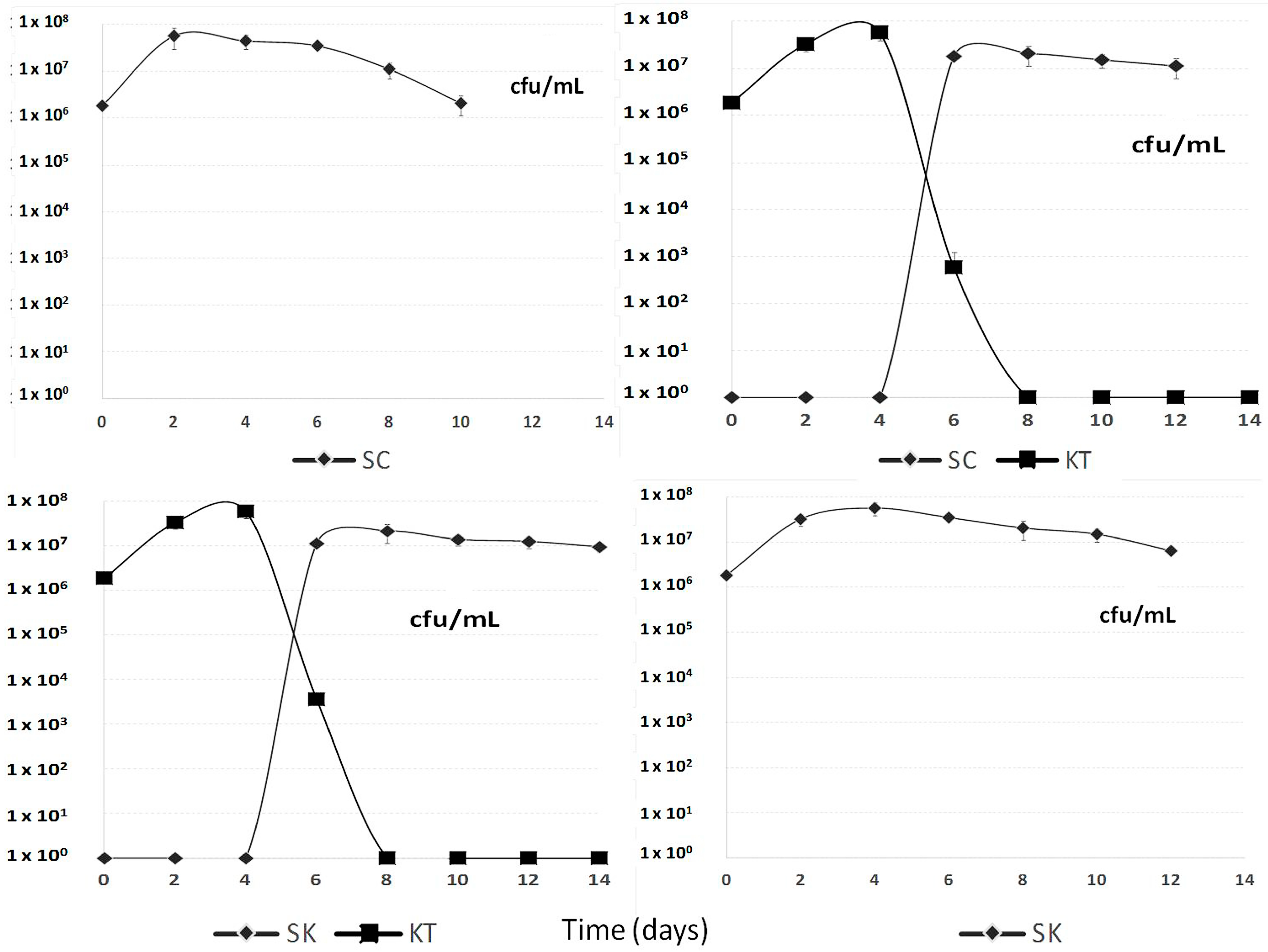 Population development of Saccharomyces cerevisiae 87 (SC), Kluyveromyces thermotolerans CONCERTO™ (KT) and Schizosaccharomyces pombe V2 (SK) during the different sequential fermentation processes.