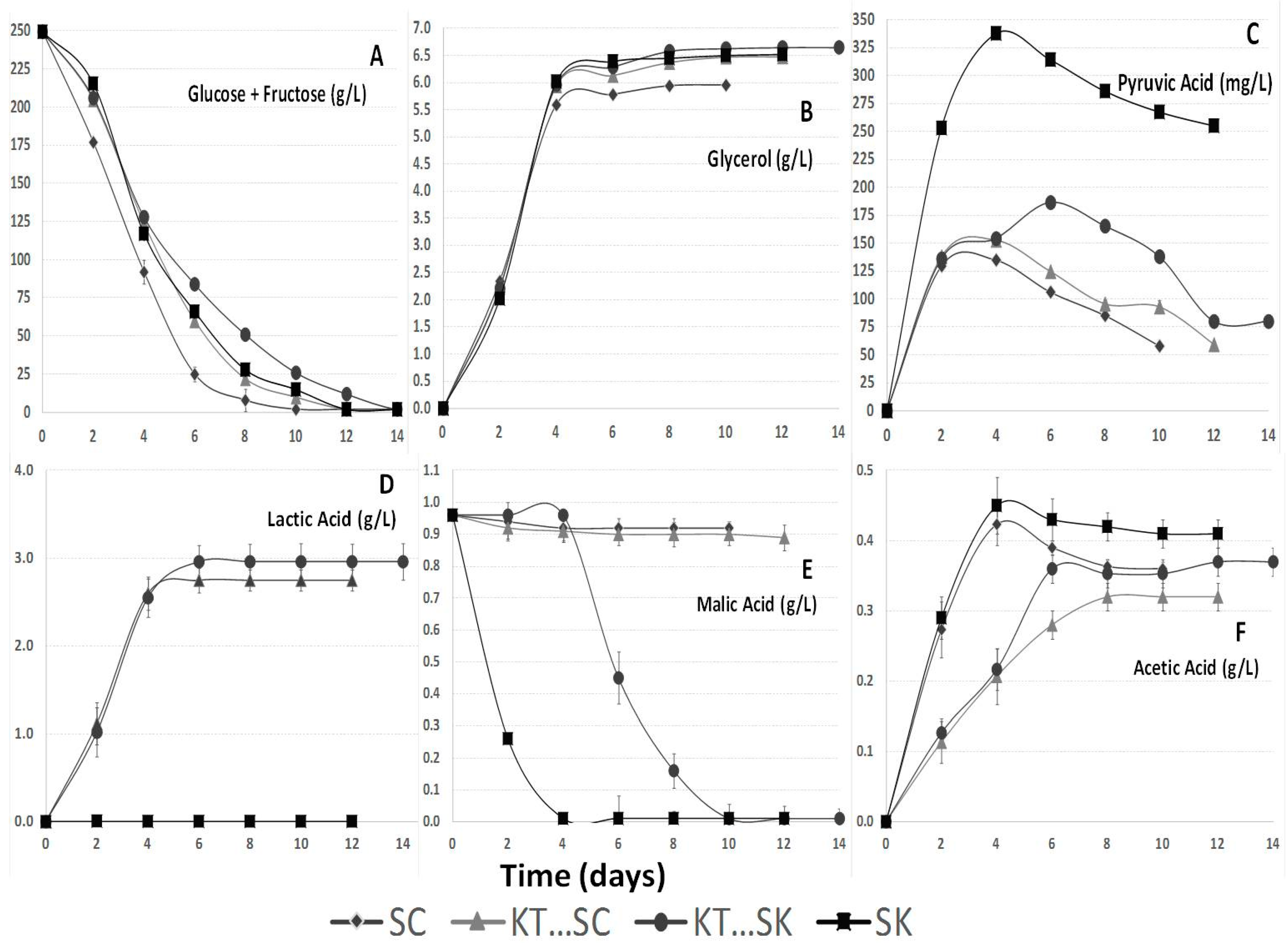 (A) Glucose + fructose concentrations (g/L); (B) Glycerol concentrations (g/L); (C) Pyruvic acid (mg/L); (D) l-Lactic acid concentrations (g/L); (E) l-Malic acid concentrations (g/L); (F) Acetic acid concentrations (g/L). Parameters of the studied wines based on Tempranillo variety during fermentations performed by Saccharomyces cerevisiae 87 by itself (SC), sequential fermentation with Saccharomyces cerevisiae 87 and Kluyveromyces thermotolerans CONCERTO™ (KT···SC), sequential fermentation with Schizosaccharomyces pombe V2 and Kluyveromyces thermotolerans CONCERTO™ (KT…SK), and Schizosaccharomyces pombe V2 by itself (SK).