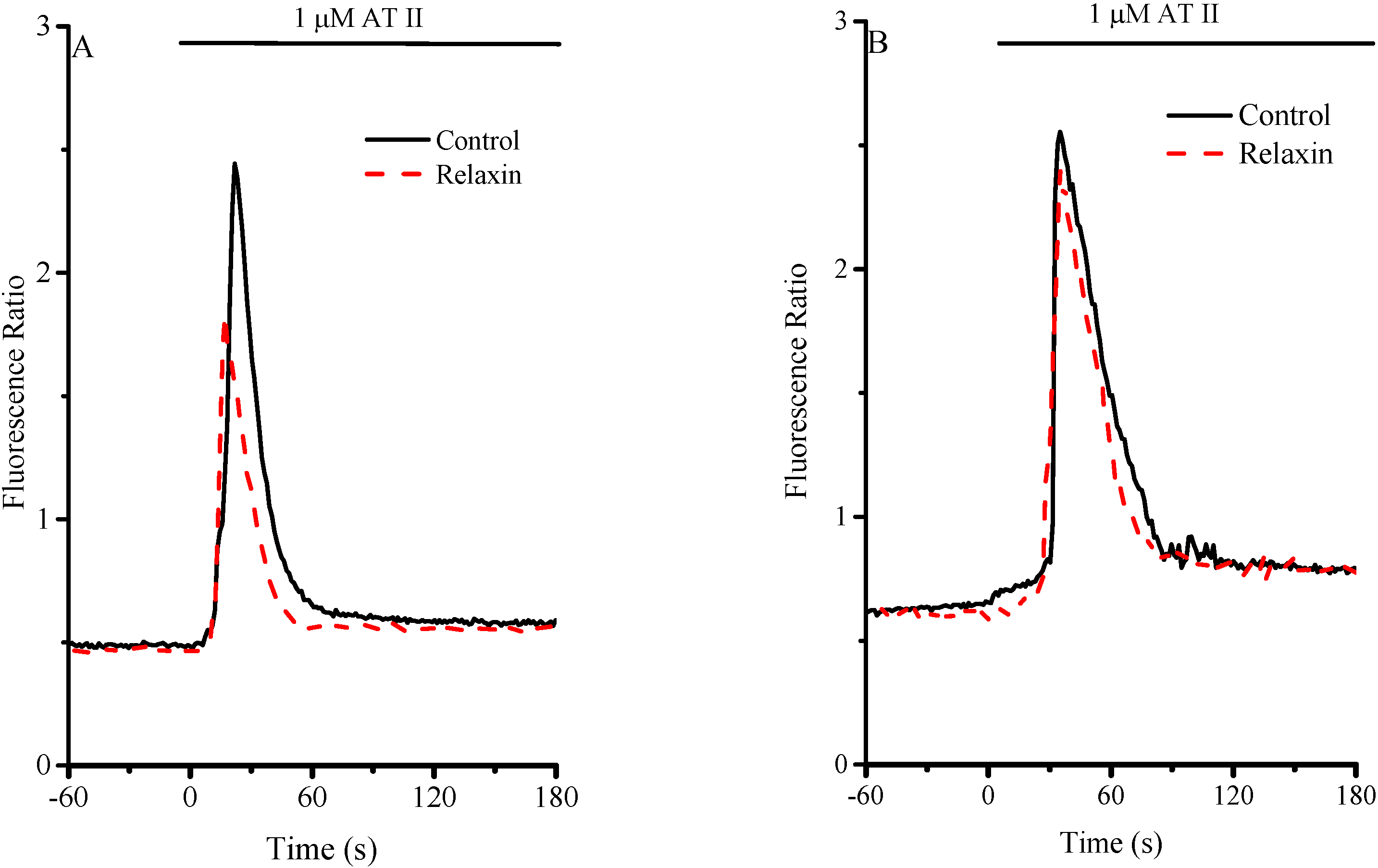 Evaluation of [Ca2+]i. in RCE isolated from WKY and SHR rats. (A) Representative tracings of [Ca2+]i-associated fluorescence in Fura-2 RCEs from WKY rats in control and RLX-pretreated cultures upon challenge with AT-II; (B) Representative tracings of [Ca2+]i-associated fluorescence in Fura 2-loaded RCEs from SHR in control and RLX-pretreated cultures upon challenge with AT-II. AT-II (1 μM) was added at the arrow (time = 0) and maintained throughout the experiment, as indicated. Cells were incubated for 24 h in serum-free medium in the absence (controls) or presence of 60 ng/mL RLX.