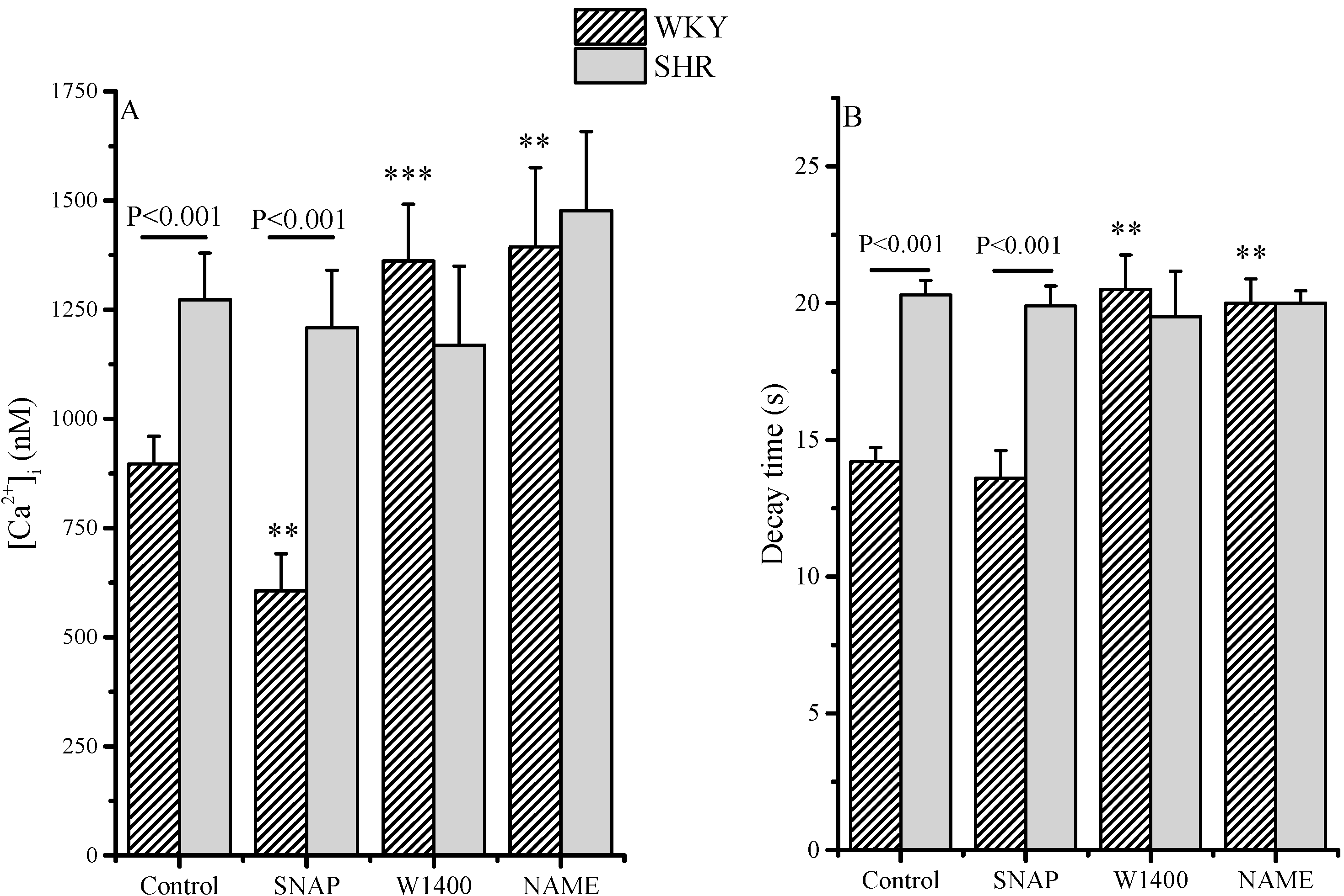 Evaluation of [Ca2+]i in RCE isolated from WKY and SHR rats. [Ca2+]i increase (maximal value at the peak, (A) and [Ca2+]i transient decay time (B) in WKY and SHR RCEs. SNAP (100 µM), L-NAME (10 µM) or W1400 (1 µM) were incubated 20 min before the administration of AT-II (1 µM). Values are the mean (±S.E.M.) of data from three separate RCE cell isolations, where at least 20–24 cells for each type of protocol were separately analyzed. Segments on the top of bars indicate significance between WKY and SHR; stars indicate significance between treatment and control, same strain: *** p < 0.001; ** p < 0.01.
