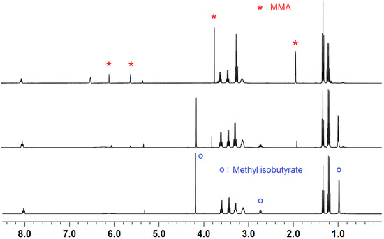 1H-NMR spectra (CD2Cl2) of a mixture of Et3N/B(C6F5)3/MMA in the ratio of 1:1:1 (top), 1:1.5:1 (middle) and 1:2:1 (bottom, some amount of Et3N-H···H-B(C6F5)3 remains due to a slight deficiency of MMA).