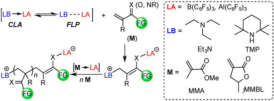 - Zhang, Y.T.; Miyake, G.M.; John, M.G.; Falivene, L.; Caporaso, L.; Cavallo, L.; Chen, E.Y.X. Lewis pair polymerization by classical and frustrated Lewis pairs: Acid, base and monomer scope and polymerization mechanism. Dalton Trans. 2012, 41, 9119–9134. [Google Scholar] [CrossRef] [PubMed]