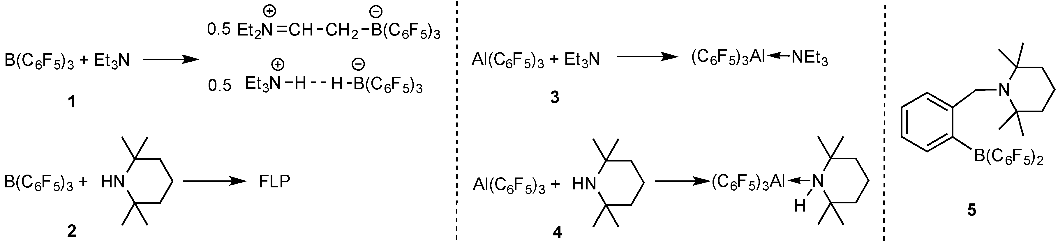 - Stephan, D.W. Frustrated Lewis pairs: From concept to catalysis. Acc. Chem. Res. 2015, 48, 306–316. [Google Scholar] [CrossRef] [PubMed]
