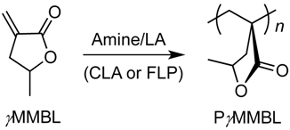 In the case of linear MMA, the Et3N/2B(C6F5)3 pair promotes transfer hydrogenation of MMA to form methyl isobutyrate. The TMP/B(C6F5)3 FLP is also incapable of polymerizing MMA, attributable to the steric hindrance and low nucleophilicity at N in TMP, which resulted in no formation of the active propagating species. In contrast, the amine/LA pairs promote rapid polymerization of γMMBL carrying the more reactive exocyclic methylene moiety, achieving full conversion in less than 3 min even at a low catalyst loading of 0.0625 mol %. The Al/Et3N pair displays higher activity when compared with the B/Et3N pair. Meanwhile, TMP is more efficient than Et3N when paired with either the borane or the alane. Of the four LA/LB pairs investigated in this study, the TMP/Al(C6F5)3 pair exhibits the highest activity, achieving a maximum TOF of 96,000 h−1 at 0.125 mol % of catalyst loading or 32,000 h−1 at 0.0625 mol %, producing high molecular weight PγMMBL with Mn = 1.29 × 105 or 1.38 × 105 g∙mol−1, respectively. As compared with the previous LBs employed for LPP, such as phosphines and NHCs, the current LPP system utilizing the inexpensive, readily available and more stable and environmentally friendly amine LBs will provide a greener alternative approach toward bio-renewable polymers based on γMMBL and other monomers.