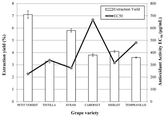 The antioxidant activities of the extracts were analyzed and lower EC50 values (associated with a higher antioxidant activity) were obtained for the varieties Petit Verdot followed by Syrah (Figure 1). In this case, the antioxidant capacity of the Cabernet Sauvignon samples was the lowest. Comparison of the antioxidant capacities of the extracts obtained in this work with data published previously by other authors shows that the antioxidant capacity of the extracts obtained in this work are lower and are still far from that obtained for the standard (+)-α-tocopherol (EC50 = 6.17 ug/mL) [26]. As a consequence, PLE was explored, as it is considered to be an efficient technique for the extraction of polar or slightly polar compounds from different natural materials [16,26,27].The results obtained in PLE experiments using ethanol for the different varieties of grapes analyzed are presented in Figure 2. Once again, the highest global yields were obtained when Petit Verdot was used, followed by Syrah and Tempranillo. In this case, the lowest global yield was obtained when the extraction was carried out on the Tintilla variety. However, according to the anthocyanins and phenolic recovery, Tintilla, Syrah and Tempranillo showed higher yields of anthocyanins whereas Petit Verdot, Syrah and Cabernet presented the higest phenolic yields (Table 1).