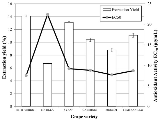 As far as the antioxidant capacity is concerned, the highest antioxidant capacities were obtained in the extraction on the Petit Verdot variety. The results obtained with Merlot, Tempranillo, Cabernet Sauvignon and Syrah were very similar and presented values of EC50 close to (+)-α-tocopherol between 7.5 and 9.2 μg/mL. Nevertheless, there are significant differences with the Tintilla grape, which gave the lowest results (higher EC50).
