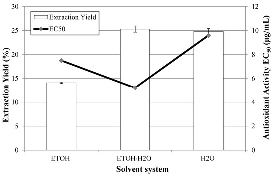 In order to select the most suitable solvent system in this work, a study was carried out to evaluate PLE procedures with different solvent composition, namely pure ethanol, ethanol/water (50:50) and water, and the results for the global yield and antioxidant activity are represented in Figure 3.