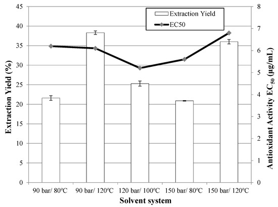 It can be seen in Figure 4 that a considerably higher extraction yield is obtained at 120 °C and, at this temperature, the highest antioxidant activity is achieved at 120 bar.