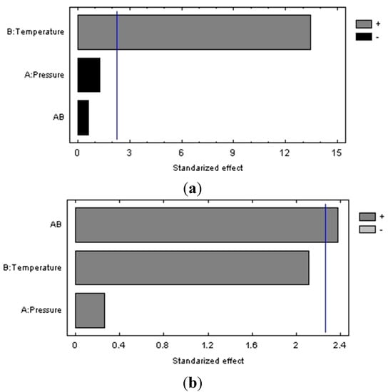 Pareto diagram (a) for the global extraction yield (b) for the antioxidant activity, obtained by PLE with ethanol/water (50:50) from Petit Verdot grape pomace.