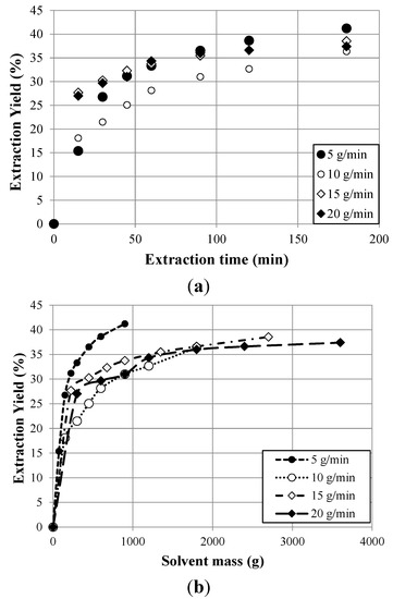 It is remarkable that, in the initial stage of the process, the extraction rate is dependent on the flow. At 15 min, a higher extraction yield was obtained in the process with a solvent flow rate of 20 g/min than that obtained at 5 g/min. This behavior is as one would expect; an increase in the flow rate leads to higher yields of extracts. This effect is due to the presence of a large amount of solvent in the operation, a factor that enhances the extraction yield. For extraction times above 50 min, an increase in the flow did not lead to an improvement in the extraction process, despite the fact that solvent consumption was high. In this second part, the slope of the curve decreased and the extraction rate was reduced until a limiting yield was reached, which depended on the total amount of extractable solutes under the fixed operating conditions. As a result, it is advisable to work at a flow rate of 5 g/min for 90 min. Under these conditions a yield of 87% was obtained after 180 min. This behavior is commonly seen using different raw materials [41].