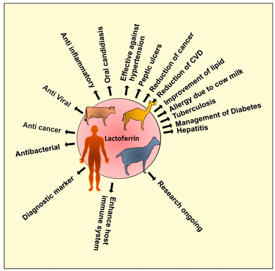 Lactoferrin and its functions. Lf from bovine source is a promising candidate as an anticancer agent [13,14]. Lf from goat source is still unexplored and not many studies have been conducted to determine its unknown therapeutic efficiency [15]. Lactoferrin is the focus of the recent interest. Lf from camel was found to be more effective against hepatitis [16] and diabetes [17], thus proving to be a broad spectrum therapeutic, antibacterial [18] protein. A very striking study on human lactoferrin has shown that it can be used as a diagnostic marker for various cancers. Moreover, Lf also boosts the host immune response [19,20] and is also known to have an anti-inflammatory activity [21].