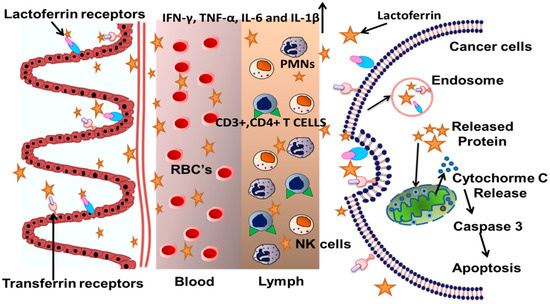 Role of lactoferrin in the activation of immune cells. Lactoferrin enters in the intestinal microvilli through the help of lactoferrin receptors and transferrin receptors present on the mucosal surface of the intestinal cells. The lactoferrin molecule further boosts up the immune response due to IFN-γ, TNF-α, IL-6 and by activating NK cells, PMNs and CD3+ and CD4+ T cells. Finally the lactoferrin enters the cells by receptor mediated endocytosis where it is released within the cells once the receptors are digested by endosomes. The lactoferrin induces release of cytochrome C from mitochondria which further activates caspase 3 to cause apoptosis in tumour cells [41,117,118,119,120,121,127].