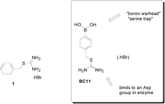 - Spencer, J.; Burd, A.P.; Adatia, T.; Goodwin, C.A.; Mérette, S.A.M.; Scully, M.F.; Deadman, J.J. Synthesis, Structural Studies and Biological Evaluation of 2-Mercaptomethyl- and 2-Piperazinomethyl-Phenylboronic Acid Derivatives. Tetrahedron 2002, 58, 1551–1556. [Google Scholar] [CrossRef]