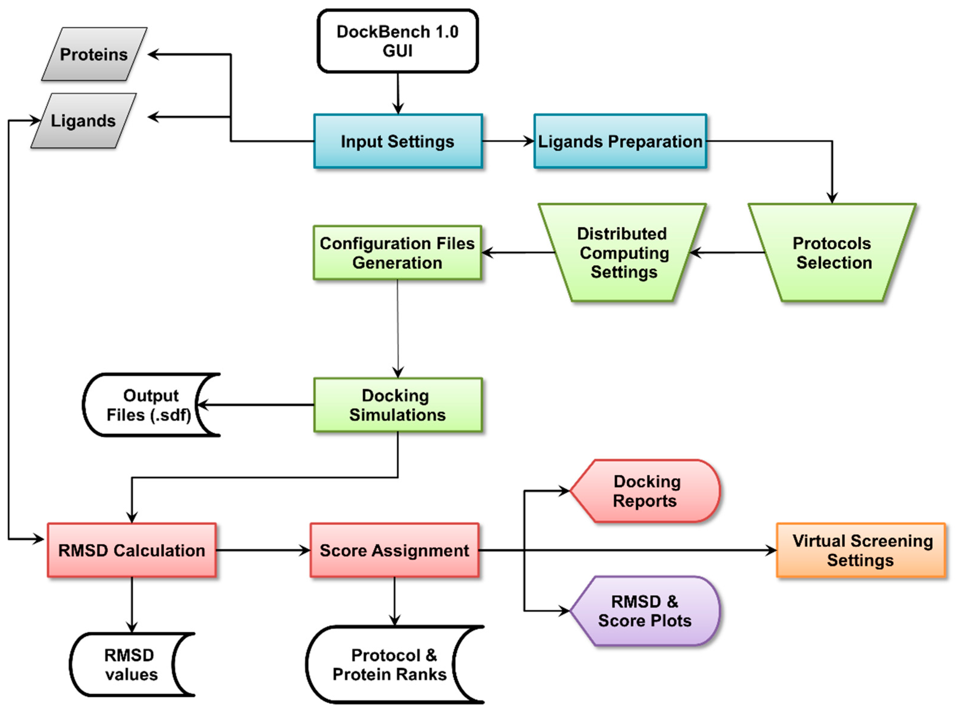 In the present work, we move a step forward and present DockBench 1.0, a platform available free of charge upon request that fully automates the entire procedure from the setup of docking benchmarks to VS campaigns. In its current implementation, DockBench 1.0 handles seven different docking software packages and provides the user with the possibility to test up to seventeen protocols. A GUI guides the user step-by-step throughout all the stages required to perform the entire pipeline, from the choice of the docking protocol to assess to the VS of large chemical libraries. The results are expressed in terms of the above mentioned quality metrics and returned as easy to interpret coloured maps. The outputs of the different software packages are returned in a unique format and are analysed with a standardized procedure to avoid software related biases.