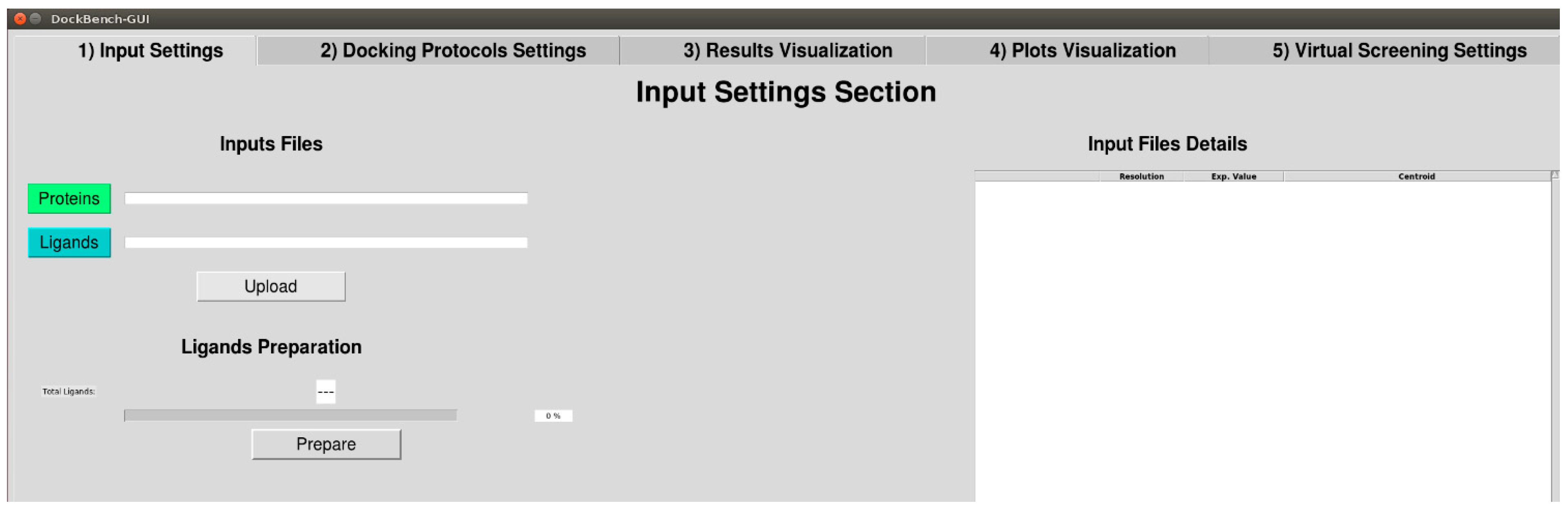 The Flowchart of the DockBench 1.0 platform is reported in Figure 1. All the functionalities are embedded in a graphical user interface (GUI, Figure 2) and are organized into five main tabs, corresponding to the tasks required to carry out a complete pipeline, from docking benchmark studies to VS experiments: (1) Input Settings; (2) Docking Protocols Settings; (3) Results Visualization; (4) Plots Visualization; (5) Virtual Screening Settings. The main features of each tab are discussed in the following. DockBench 1.0 is available free of charge and can be requested at the project page [12].