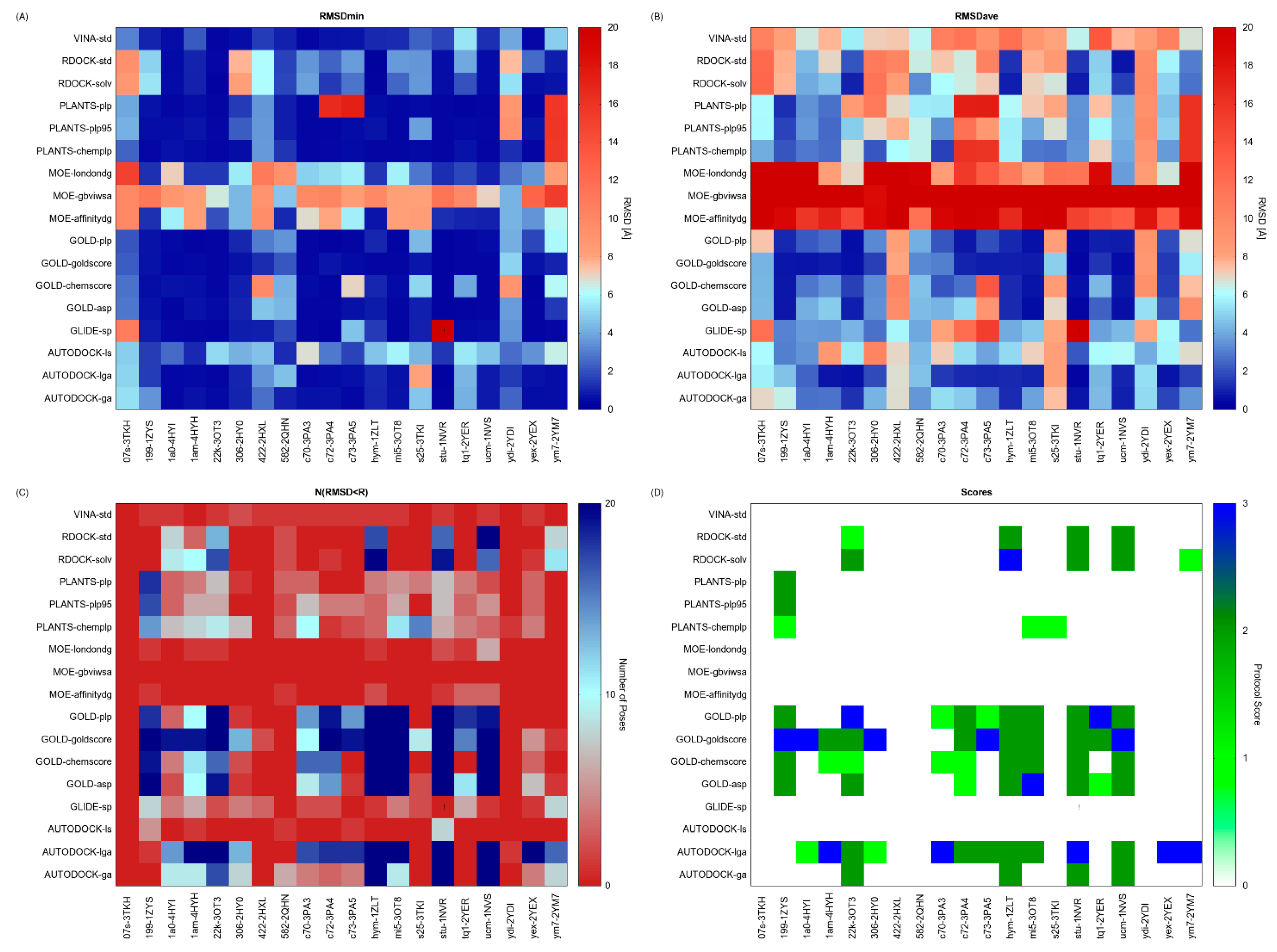 Results of the docking benchmark study on human checkpoint kinase 1. (A) Minimum RMSD values (RMSDmin) returned by the tested docking protocol (y-values) for the considered X-ray structures (x-values); (B) Average RMSD values (RMSDave); (C) Numbers of conformations returned by each docking protocol having a RMSD value lower than the X-ray structure resolution (N(RSMD < R)); (D) Protocol Score. RMSD is expressed in Å, whereas the Protocol Score on a 0–3 points scale. Values are rendered with a colour code, blue spots identify the best obtained results. Exclamation marks warn that an error occurred during docking calculations.