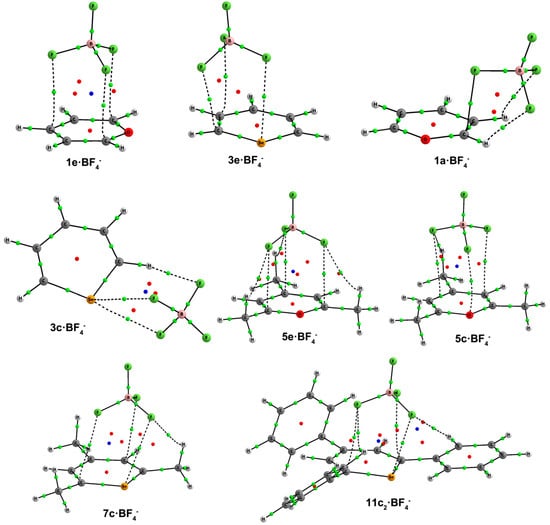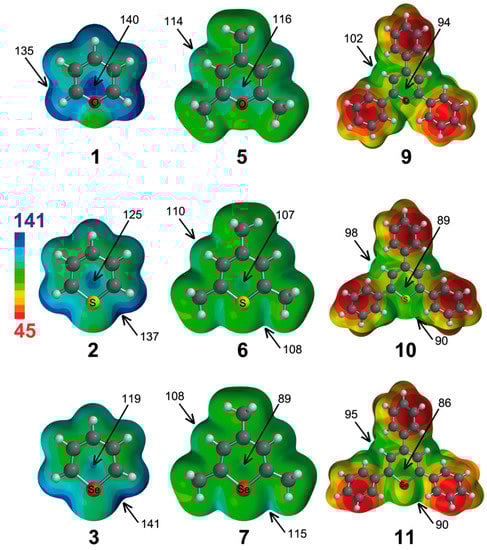 We have also computed the molecular electrostatic potential (MEP) surfaces of the pyrylium cations and analogues (except from tellurium compounds), which are represented in Figure 2. From the analysis of the MEPs, several considerations can be made. The pyrylium Compound 1 has the highest electrostatic potential (ESP = 140 kcal·mol−1) located at the center of the molecule, although a little bit displaced towards the location of the oxygen atom. The ESPs associated with in-plane interactions are 5 kcal·mol−1 lower in energy. If we change the X atom, we observe how the ESP located above the molecular plane diminishes (to 125 and 119 kcal·mol−1 for 2 and 3, respectively). Interestingly, the highest ESP for 2 and 3 is located at both sides of the X atom (137 and 141 kcal·mol−1, respectively). Therefore, from electrostatic considerations, the most favorable anion complex of 1 would be that where the anion is positioned above the ring, whereas the most favorable complexes of 2 and 3 would be those where the anion is located in the molecular plane and close to the X atom. However, for π interactions, polarization effects can be important, and the prediction based only on electrostatic effects may not be adequate. As inferred from Figure 2, the trimethyl Derivatives 5–7 have less positive values of ESP than their respective unsubstituted counterparts, and likewise, the triphenyl Analogues 9–11 have less positive ESP values than their respective trimethyl derivatives.
