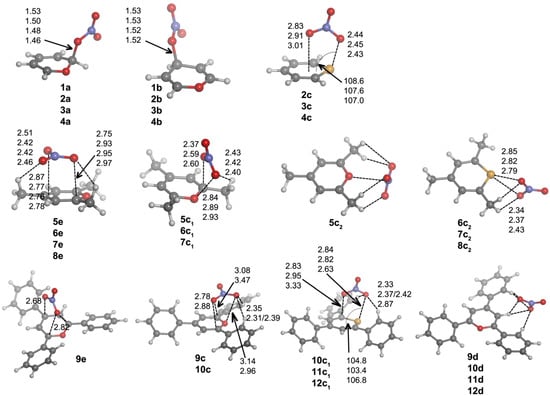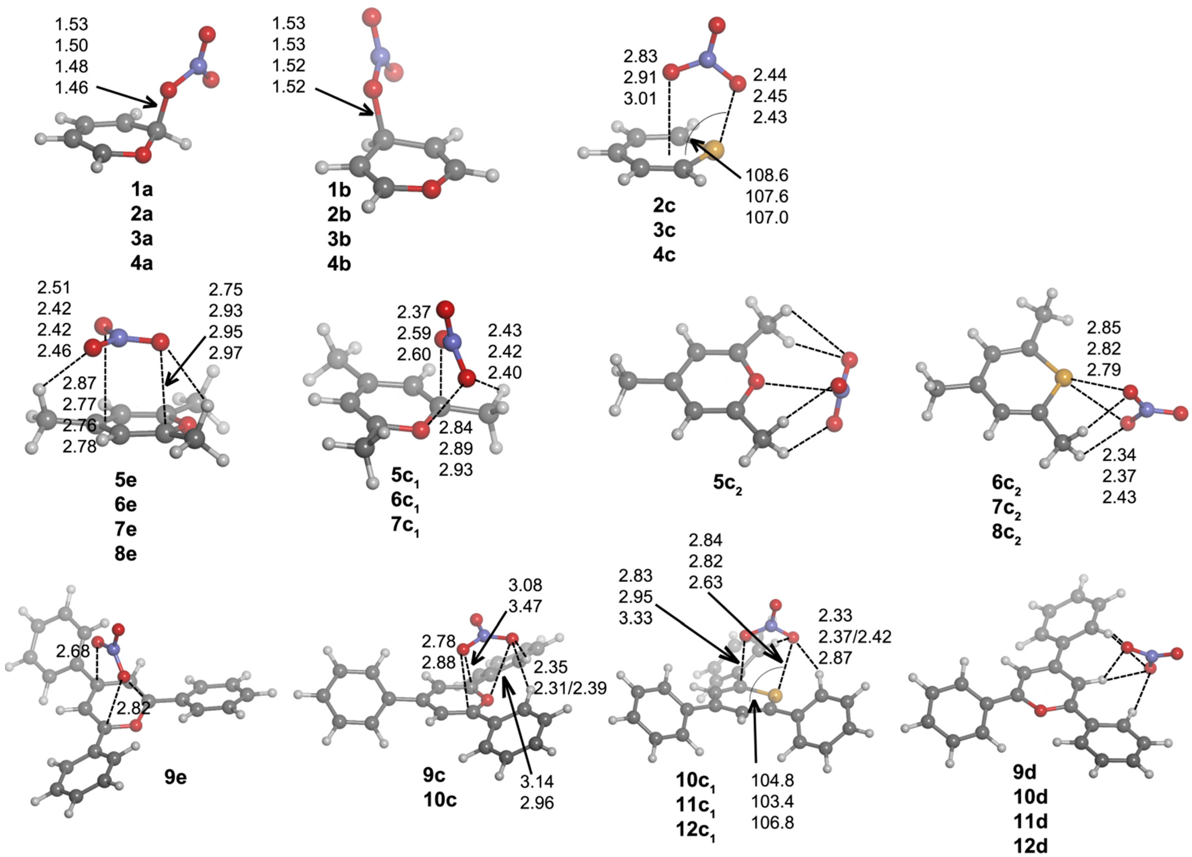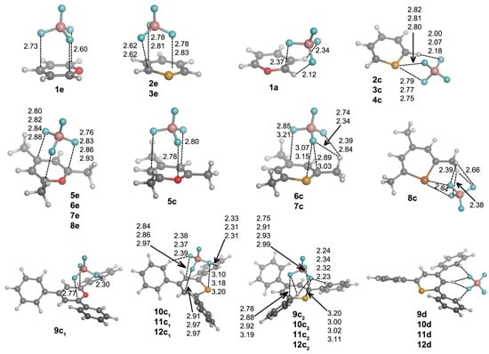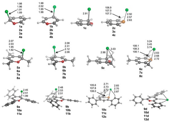 First, we are going to analyze the complexes of Compounds 1–12 that are formed with chloride. After exploring the potential energy surface of the different complexes, four main structural configurations were found. Type a and b complexes are the result of a nucleophilic attack of the anion to C1 and C3 atoms, respectively, of the heteroaromatic ring, giving rise to σ-complexes. Thus, according to our nomenclature, 1a will be the σ-complex of 1 with Cl–. In Type c complexes, the anion is located above the molecular plane, either interacting with C1 and C5 or the chalcogen atom. Lastly, Type d complexes are based on hydrogen bonding interactions. Several geometrical features of the complexes with chloride are shown in Figure 3, and their corresponding binding energies are gathered in Table 2.