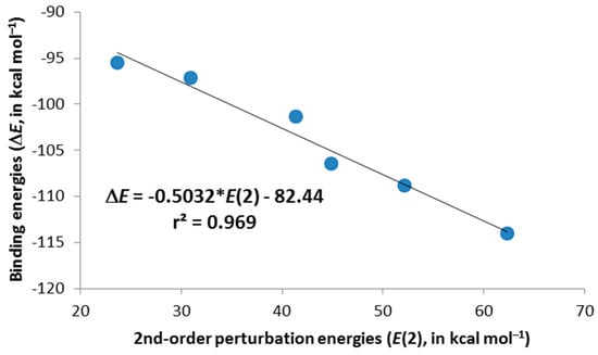 Selected second-order perturbation energies, E(2), plotted vs. the computed binding energies, ∆E, for 2c–4c·Cl– and 6c–8c·Cl– complexes.