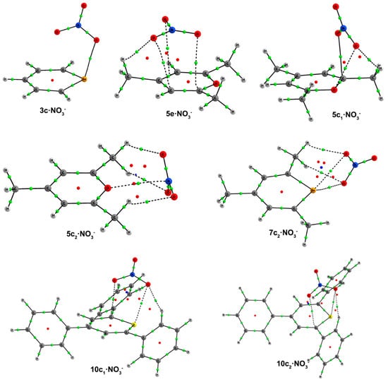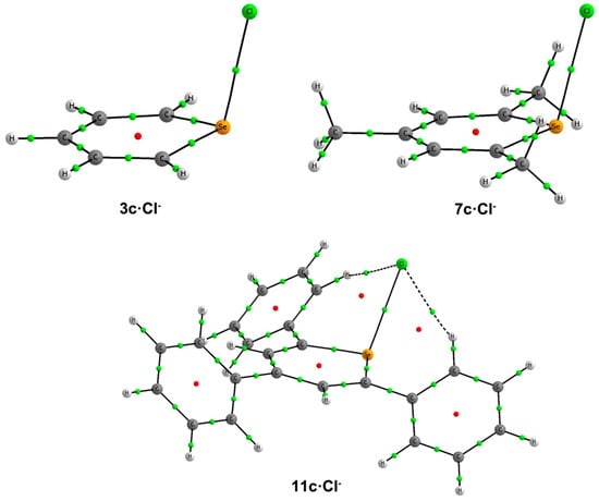 In line with the NBO results, our AIM calculations for 2c–3c·Cl–, 6c–7c·Cl– and 10c–11c·Cl– complexes show the existence of one BCP connecting the X atom with Cl– (Figure 5). The values of the electron densities at these BCPs range between 0.061 au for 2c·Cl– and 0.041 au for 10c·Cl– (Table 2). At these BCPs, the values of the Laplacian are positive, and the total energy densities are negative (between −0.010 and −0.003 au), suggesting that these interactions have a certain covalent character [].